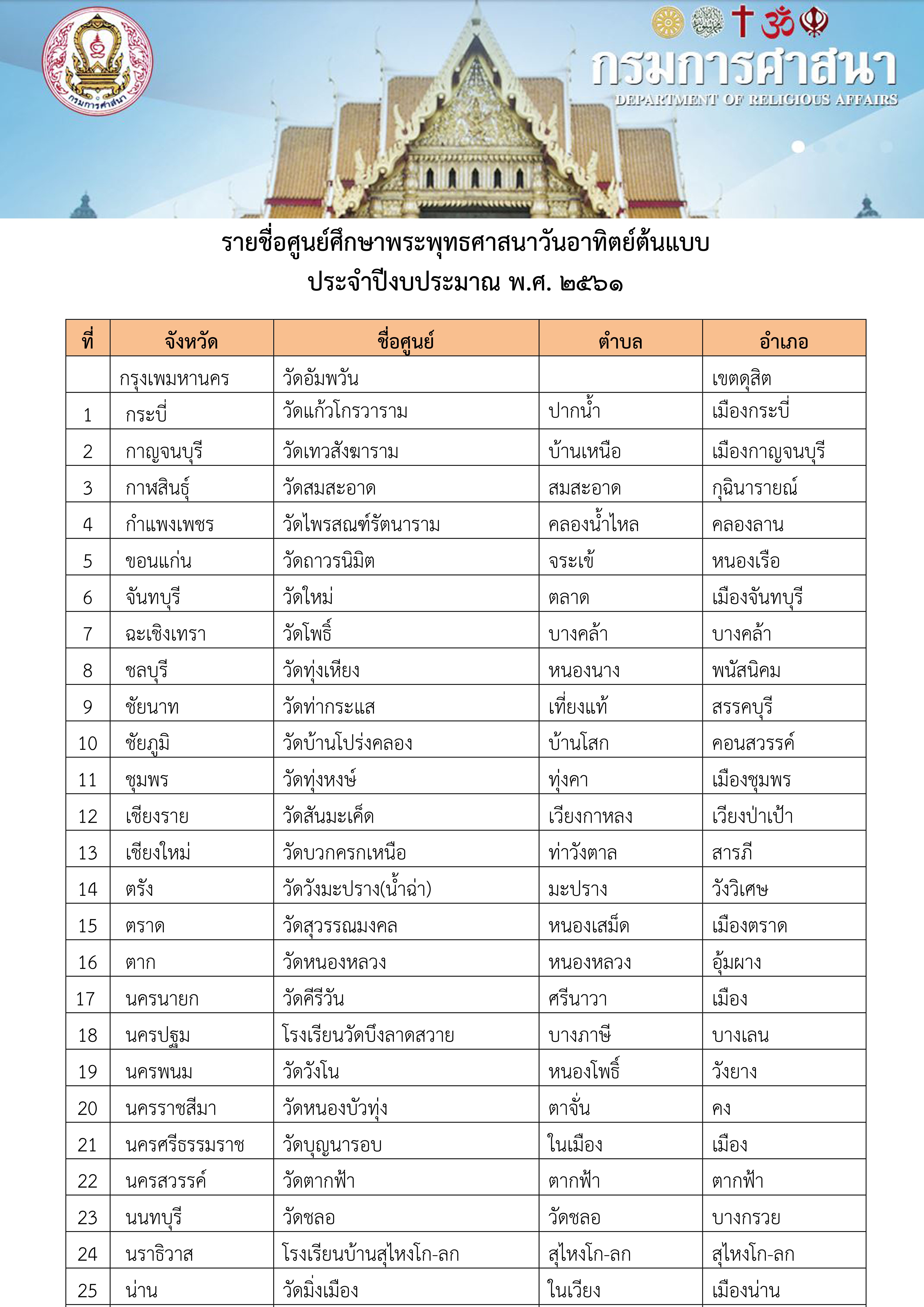 รายชื่อศูนย์ศึกษาพระพุทธศาสนาวันอาทิตย์ต้นแบบ ประจำปีงบประมาณ พ.ศ. ๒๕๖๑